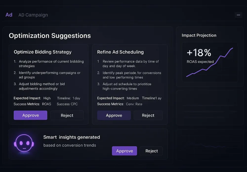 Enable our AI engine to analyze your campaigns and generate personalized optimization suggestions tailored to your goals.