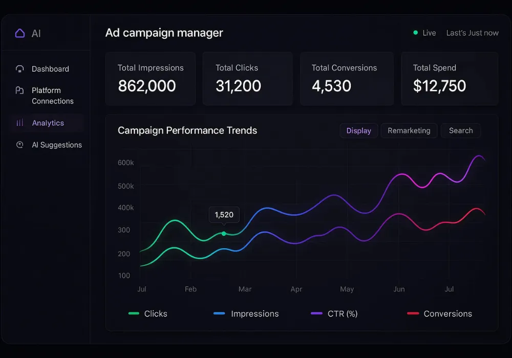 Monitor critical metrics like impressions, clicks, conversions, and ROAS in real-time to make informed decisions instantly.