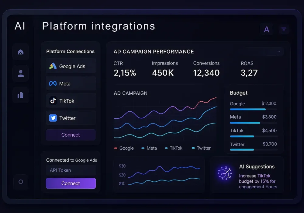 Easily integrate your existing ad accounts from Google, Meta, TikTok, and Twitter with secure API connections.